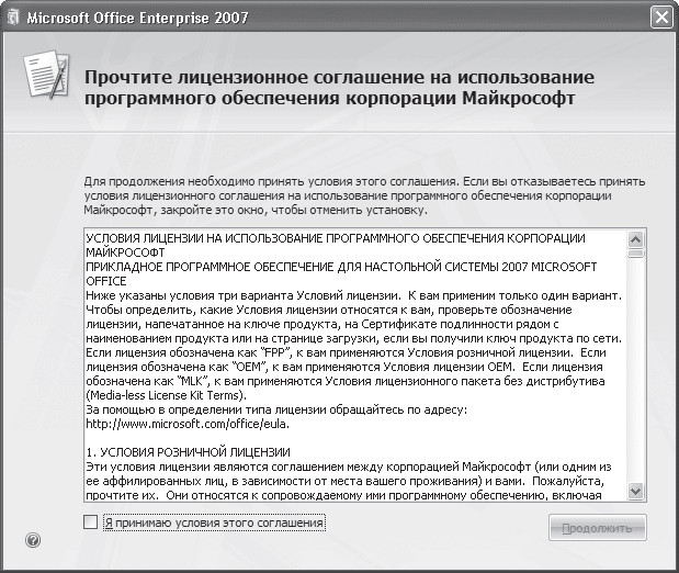 Появится следующее окно (рис. 1.2). Оно содержит лицензионное соглашение, с условиями которого необходимо согласиться, установив соответствующий флажок. Если этого не сделать, установка Microsoft Office будет прервана.