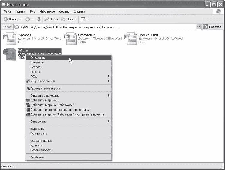 • щелкнув правой кнопкой мыши на названии файла в окне программы Проводник или в окне папки и выбрав в контекстном меню строку Открыть (рис. 1.14);