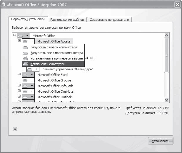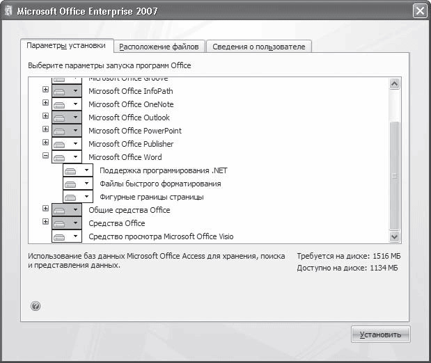 При нажатии кнопки Установить будут установлены практически все компоненты Microsoft Office. Состав приложений для установки определен заранее и не может быть изменен. При щелчке на кнопке Настройка появится окно, в котором можно выбрать устанавливаемые компоненты и указать другие параметры инсталляции.