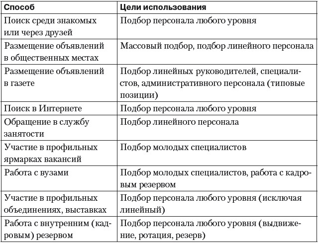 Способы поиска и подбора персонала можно разделить на несколько групп, и в этом нам поможет табл. 2.1.
