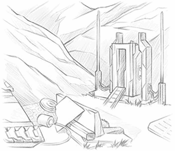 Взору предстала бескрайняя, уходящая резко вниз долина, покрытая лесом. От того места, где стоял Макс, расходились две едва угадываемые тропинки. Одна – в лес, а вторая… Она кончалась выгоревшей пустошью, заваленной обломками какой-то техники и обугленными остатками древесных стволов. Невысоко в небе над этим пожарищем висел тот самый корабль пришельцев – блестящая сферическая громадина с пробоиной в боку, из которой валил чёрный дым.