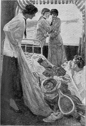 We carried the heavy basket of clean bed linen upstairs and made our way through the dressing rooms, which were little more than closets, to the spacious sleeping porches, overlooking the bay. We found the place in very good order, considering boys had been keeping bach there for a month, and it was not at all "goatish," as we had been led to expect to find it. On the first porch we discovered an old checked cap on a hook, and some discarded tennis shoes in a corner, under one pillow a wallet, rather fat with bank bills, and under another a large gold watch.