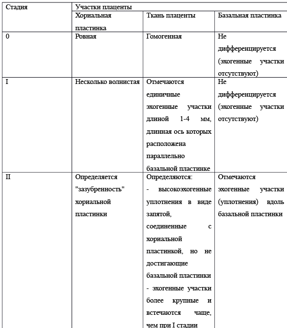 До появления приборов с серой шкалой специалисты УЗ диагностики ограничивались лишь определением локализации и размеров плаценты. Впервые возможности оценивать при УЗ исследовании структуру плаценты были описаны F.Winsberg в 1973 году. [2]. Автором были выделены два типа плацент – однородная и неоднородная. С внедрением в практику серошкальной эхографии стала возможной более детальная оценка структурных изменений плаценты, связанных, как показали результаты выполненных исследований, со сроком беременности. Так, было установлено, что если во II триместре плацентографическая картина носит гомогенный характер, то к концу беременности начинают определяться участки повышенной эхогенности (эхогенной плотности), которые являются результатом отложения кальция и фибрина [3, 4]. При этом, по данным W.W.Stein и соавт. [5] по мере увеличения срока беременности высокоэхогенные участки распространяются в плаценте в направлении от ее материнской поверхности к плодовой, в виде перегородок плаценты, что характерно для 36 и более недель беременности. Дальнейшие УЗ плацентографические исследования привели к разработке классификационной оценки изменений структуры плаценты. Наиболее распространенной в настоящее время является систематизация состояния трех ее областей, предложенная P.A.Grannum и соавт [6]: хориальной пластинки, самой плацентарной ткани и ее базальной пластинки. При этом оцениваются такие показатели как: