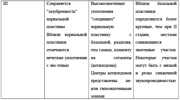 Последовательное прохождение плацентой выделяемых при ультразвуковом исследовании стадий позволяет рассматривать регистрируемые таким образом изменения ее структуры как отражающие степень ее зрелости. В пользу этого свидетельствуют установленные А.П.Миловановым [10] эхоморфологические параллели, подтверждающие соответствие эхокартины развивающейся плаценты этапам гистогенеза ворсин. Более того, отмеченная определенная последовательность изменений структуры плаценты по мере развития беременности позволила предположить, а в последующем и подтвердить зависимость между характеристиками ее структуры и степенью зрелости плода [6, 8, 9, 11]. При этом, согласно данным большинства авторов, наличие III стадия изменений структуры плаценты при физиологически протекающей беременности является достоверным прогностическим признаком зрелости легких плода [12-14].