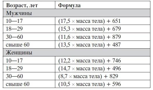 Наш организм расходует поступающую с пищей энергию по трем направлениям: основной обмен, дополнительный обмен и на переваривание и усвоение пищи. Формулы расчета основного обмена приведены ниже. Дополнительный обмен – это затраты на физическую активность. А на переваривание и усвоение пищи тратится 5—10 % поступающей энергии. Конкретно это зависит от ее химического состава. Больше всего энергии тратится на переваривание белков животного происхождения. В этом случае расход калорий (энергии) достигает 30–40 % от калорийности белков. Расходы на переваривание углеводов составляют 4–7 %, жиров – 2–4 %.