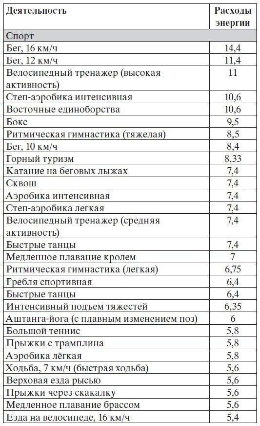Энергозатраты можно рассчитать по следующей таблице, где указаны расходы энергии (в килокалориях) за час деятельности на 1 кг веса. То есть ваш вес вы должны умножить на эту цифру и тогда узнаете, сколько энергии потеряете за час, занимаясь какой-либо деятельностью.