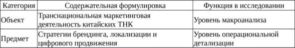 Разграничение объекта и предмета представляет собой методологический шаг, необходимый для построения корректной исследовательской рамки. В рассматриваемой диссертации объектом выступает маркетинговая деятельность китайских транснациональных компаний в условиях глобальной конкуренции. Предмет — механизмы брендинга, канальной локализации и цифровой адаптации, реализуемые компаниями Xiaomi, Huawei и Lenovo, таблица 3.