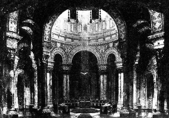 As the Holy Grail is set down on the altar before the wounded king, a burst of heavenly music streams from the high dome—voices of angels intone the celestial phrases, "Take, eat" and "This is my blood!" and blend them with the "faith and love" motives. As the choruses die away, the voice of the entranced Titurel is heard from beneath the altar calling upon Amfortas, his son, to uncover the Grail, that he may find refreshment and life in the blessed vision.