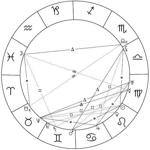 Если и в знаке Солнца, и в знаке Луны имеется по крайней мере еще по одной планете, а в прочих знаках есть только планета и (иногда) небесное тело – значит, перед нами солярно-лунарный тип космограммы. Людям с такой космограммой живется непросто, поскольку в них постоянно перевешивает то солнечное, то лунное начало. Они склонны к метаниям из стороны в сторону, колебаниям, в них побеждает то разум, то эмоции. Им свойственна психологическая неустойчивость, неспособность выбрать в жизни какой-то один путь. Такая космограмма была у Пушкина, Лермонтова, Гоголя и Гитлера.