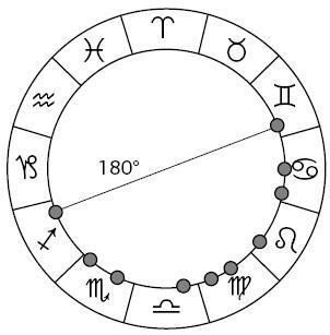 Для этой фигуры характерно скопление планет в границах сектора, равного 180° ± 20°, в остальных знаках – их может быть до пяти-шести подряд – не расположено ни одной планеты (см. рис. 8). Иначе говоря, все небесные тела находятся только в одной половине неба и образуют словно в заполненный наполовину сосуд.