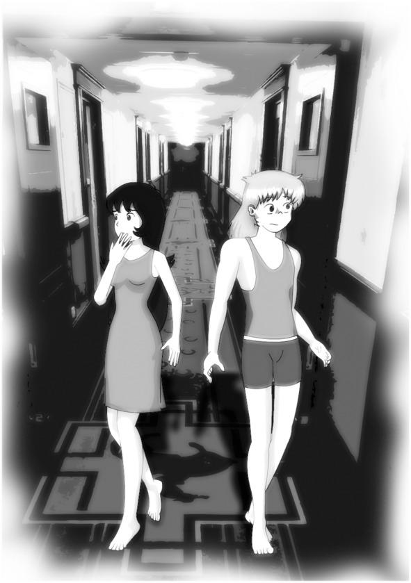 Шаги становились все громче и громче, пока из-за угла не показались два силуэта. Первым был молодой парень с длинными светлыми волосами. Он растерянно разглядывал интерьер своими голубыми глазами. Следом за ним шла девушка, стройная брюнетка в ночной сорочке, которая через секунду схватила юношу за руку и настороженно огляделась вокруг: