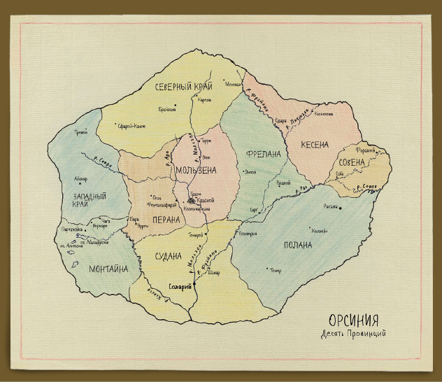Я начинаю чувствовать, что подбираюсь ближе. Начинаю слышать названия. Орсения — на латыни, на английском — Орсиния. Вижу реку Мользен, бегущую по открытой солнечной местности к старой столице, Красною (красный — славянское «красивый). Красной стоит на трех холмах: дворец, университет, собор. Собор Святой Феодоры, вопиюще несвятой святой, имя моей матери... Начинаю осваиваться, чувствовать себя как дома. Орсения, матрия мия, моя родина. Я могу здесь жить и узнавать, кто здесь еще живет и что они делают. Могу рассказывать о них истории.