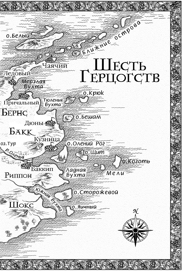 История Шести Герцогств неразрывно связана с историей правящей династии Видящих. Повествование об этой семье следовало бы начать с времен стародавних, задолго до основания Первого герцогства. Если бы до нас дошли имена дальних предков наших королей, мы знали бы, как звали тех пиратов, что совершали разбойничьи набеги и грабили побережье, где земли были не столь бесплодными и неприветливыми, как обледенелые скалы их родины — Внешних островов. Но история не сохранила их имен.