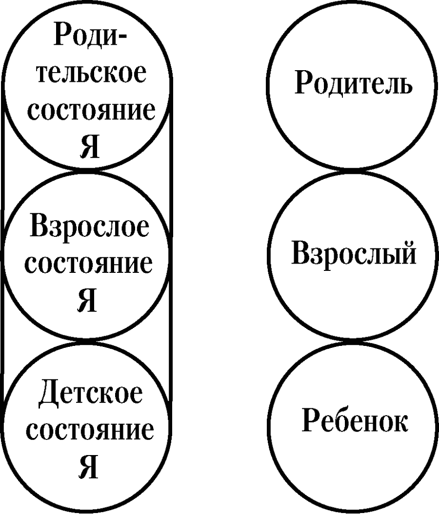 3) до сих пор активные состояния Я, сохранившиеся у нас с детского возраста, так называемые архаические образцы чувств и поведения. В обычной речи их можно называть Родитель, Взрослый и Ребенок, причем эти простые термины используются даже в самых строгих и формальных обсуждениях.
