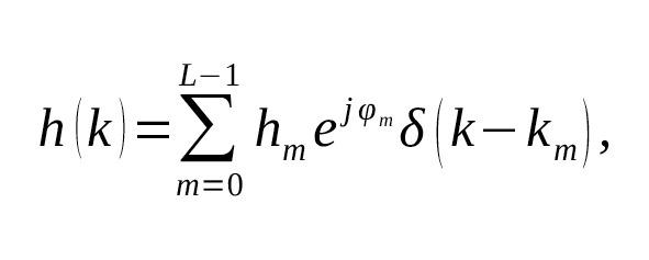 где hm — передаточные коэффициенты лучей многолучевого сигнала, φm — их фазы, km — задержки лучей в выборках, δ (n- km) — функция Кронекера, m — номер луча, L — суммарное число лучей. В случае домашней связи, например, по сети WiFi, в первом приближении функцию hm можно описать распределением Рэлея, а φm — равновероятным распределением. Стоит отметить, что в случае, когда нет прямого луча, формулой Рэлея описывается именно огибающая радиосигнала, то есть изменение коэффициента передачи суммы всех лучей описано по данному закону [54].