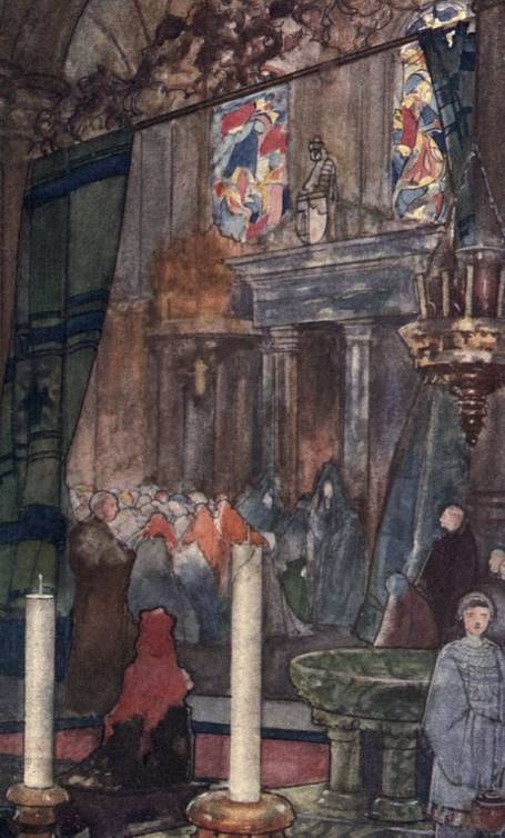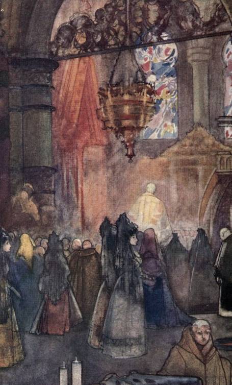 Immediately confronting him at the door was a hideous idol. A huge and brown, wooden Christ, with black horse-hair tresses, staring white eyeballs, staring red wounds, towered before him, hanging from a cross. Estéban knelt to it on one knee, and, remembering his hat, doffed it sideways over his ear. He said his two Paternosters, and then performed one odd ceremony more. Several people saw him do it, but no one was surprised. He took the long knife from his faja, running his finger lightly along the edge, laid it flat before the Cross, and looking up at the tormented God, said him another Pater. That done, he went into the church, and knelt upon the floor in company with kerchiefed women, children, a dog or two, and some beggars of incredible age and infirmities beyond description, and rose to one knee, fell to both, covered his eyes, watched the celebrant, or the youngest of the women, just as the server's little bell bade him. Simple ceremonies, done by rote and common to Latin Europe; certainly not learned of the Moors.