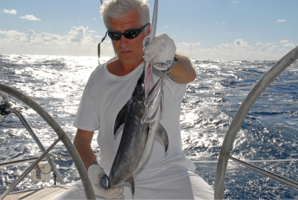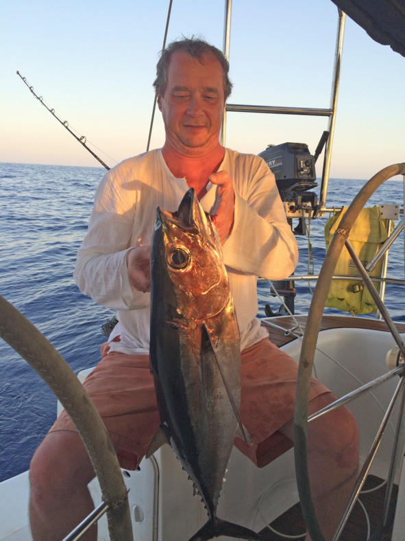 Два раза мощно клевали какие-то монстры, чуть удилище из рук не вырвали, а ведь под парусом скорость сразу не сбросишь. Днём подошли к острову Тира, затопленный огромный вулкан Санторини. Прошли с юга на север внутри кратера, отвесные стены которого поднимаются вверх на 500 метров и уходят вниз на такую же глубину. На закате, как и положено, в 19:30 клюнуло, красиво подтащили, Лёша красиво зацепил багром, и вот он на палубе — красивый 8-килограммовый тунец. Карпаччо!!! Нарезал тартар на ужин и пожарил двухминутку в панировочных сухарях. Сегодня ночью останавливаться уже негде, острова кончились, идём на южную часть полуострова Пелопоннес. Пока курс бейдевинд, ветрогенератор уверенно справляется с зарядкой батарей. Днём вообще нет проблем, солнечные батареи с лихвой покрывают все затраты, а вот когда стихает ветер ночью, приходится экономить, выключать компьютер и автопилот, идти по компасу и рулить руками.