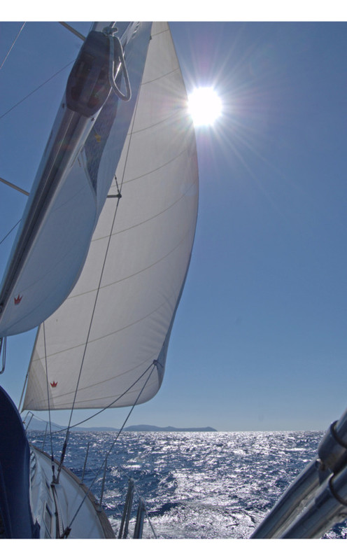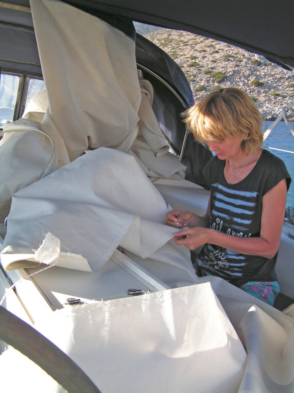 Позавтракали, оправились и пошли. Ветер в среднем 25 узлов, в порывах до 30. Выпустили полгенуи и полгрота и понеслись 8 узлов. Ветер северо-западный, с трудом удаётся идти на запад на зарифленных парусах. Когда вода стала заливать подветренный борт, ещё скрутили паруса. Сразу мягче пошли, с меньшим креном, но и скорость упала до 5 узлов. Так и шли 30 миль до острова Сирна. На подходах к острову перед закатом стали налетать порывы ветра скоростью до 40 узлов, и тут третий сверху шов на гроте лопнул на 2 метра до самой мачты. Парус скрутили. Хорошо, что в заднюю шкаторину грота заделана крепкая верёвочка, булинь, с её помощью в бухте удалось раскрутить парус и снять для починки. Остров совершенно необитаем, связи нет, воистину зачарованный остров. В южной бухте хорошая якорная стоянка, даже болтается старый муринг (буй, привязанный к стационарному якорю на дне), но мы не рискнули на него становиться, швартовая верёвка по виду гнилая. Уселись за шитьё паруса в 18 часов и закончили в 01:30. Где тот Гомер, который воспел бы новых героев Эллады, починивших парус кривыми иголками и вощёной нитью. Осталась последняя иголка. Внести в список покупок. Всем спать!
