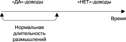 Интересно, что окраска у этих размышлений меняется со временем. Если ты хорошо и ярко отработал переговоры, заинтересовал клиента и размышления его искренни, то в течение стандартного срока принятия подобных решений клиент взвешивает доводы в пользу твоего предложения. Ему интересно, и он рассматривает «ДА-доводы». По истечении стандартного срока ситуация меняется. Клиент чувствует, что решение не принято, и находит объяснения, почему он предложение не принял. Клиент отдаляется и ищет «НЕТ-доводы».