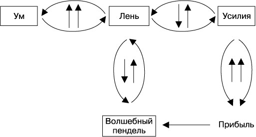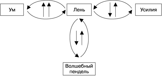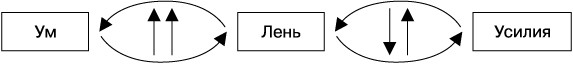 Разберем систему, состоящую из трех элементов: ум, лень и усилия. Как они связаны друг с другом? Лень и усилия компенсируют друг друга, а ум и лень усиливают друг друга, ведь интеллект дан человеку, чтобы меньше работать2 .