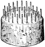 A fruit pricker is easily made and saves time (fig. 3). Cut a piece half an inch deep from a broad cork; press through this a dozen or more coarse darning needles; tack the cork on a piece of board. Strike the fruit on the bed of needles, and you have a dozen holes at once. When the work is finished, remove the cork from the board, wash and dry thoroughly. A little oil on the needles will prevent rusting. With needles of the size suggested there is little danger of the points breaking, but it is worth remembering that the use of pricking machines was abandoned in curing prunes on a commercial scale in California because the steel needles broke and remained in the fruit.