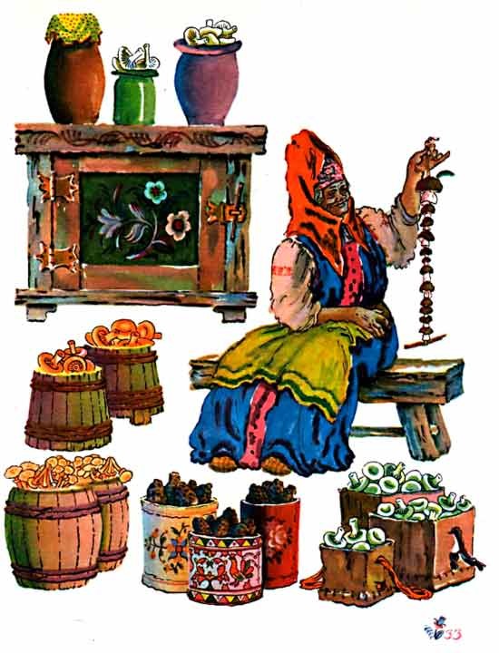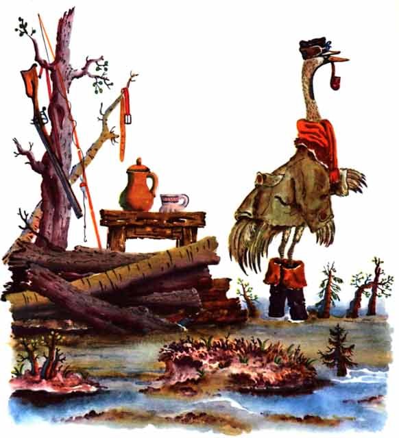 Старуха бросилась за уткой — глядь-поглядь, а утки нет! Что будешь делать, где взять? А отдать надо! Позади старухи стоит лиса, глаза куксит, голосом причитает: была у нее уточка, невиданная, неслыханная, пестрая впрозолоть, за уточку ту она бы и гуська не взяла.