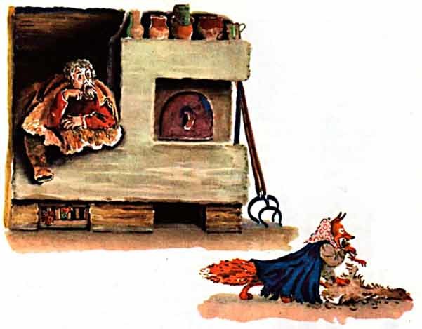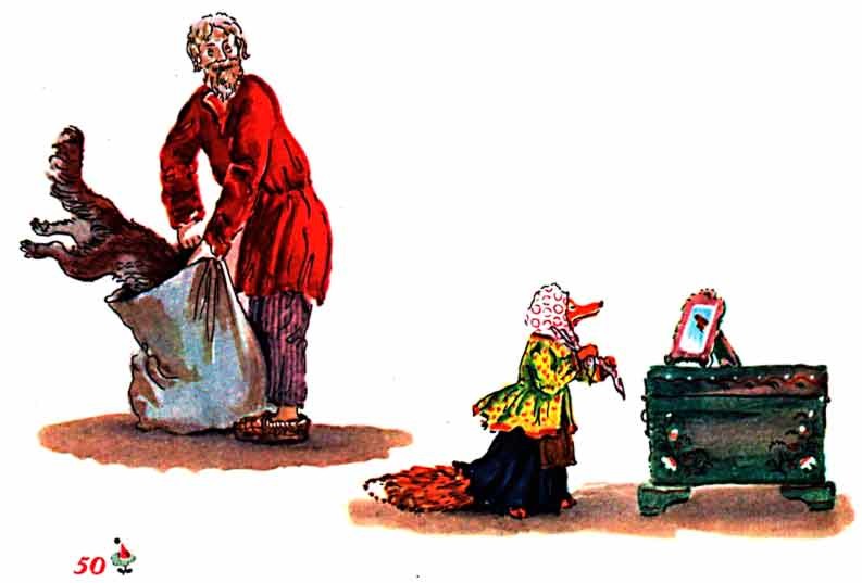 Проснулась и лиса, начала собираться в путь; поблагодарила хозяев за тепло, за угрев и стала у мужика спрашивать свою курочку.