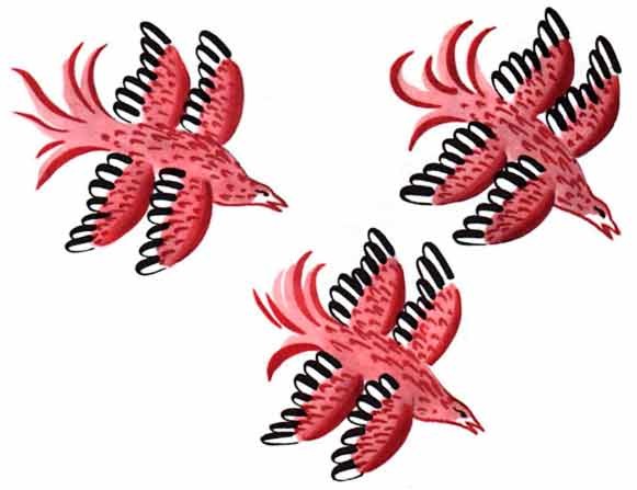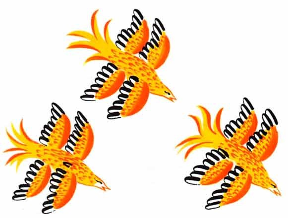 А птицы были не простые. У каждой птицы по четыре крыла. В каждом крыле по семи перьев. Каждое перо тоже со своим именем. Одна половина пера белая, другая — чёрная. Махнет птица раз — станет светлым-светло, махнёт другой — станет темным-темно.