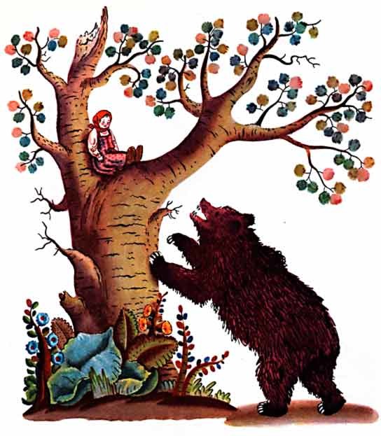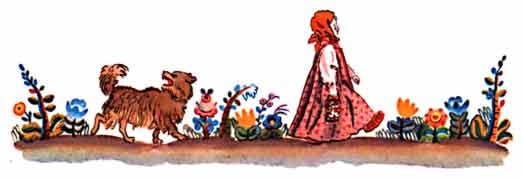 Шла она, шла, и захотелось ей спеть песенку про себя и про лапоток. Вот села она, положила мешок на землю и только было принялася петь, как вдруг выскочила из мешка хозяйская собака — да на нее, а она от собаки, а собака за нею, не отставая ни на шаг.