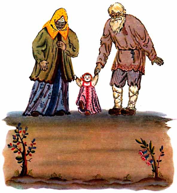— Что же будешь делать — нет, так и взять негде. Однако старик принес комочек снега в избу, положил в горшочек, накрыл ветошкой (тряпкой. — Ред.) и поставил на окошко. Взошло солнышко, пригрело горшочек, и снег стал таять. Вот и слышат старики -пищит что-то в горшочке под ветошкой; они к окну — глядь, а в горшочке лежит девочка, беленькая, как снежок, и кругленькая, как комок, и говорит им: