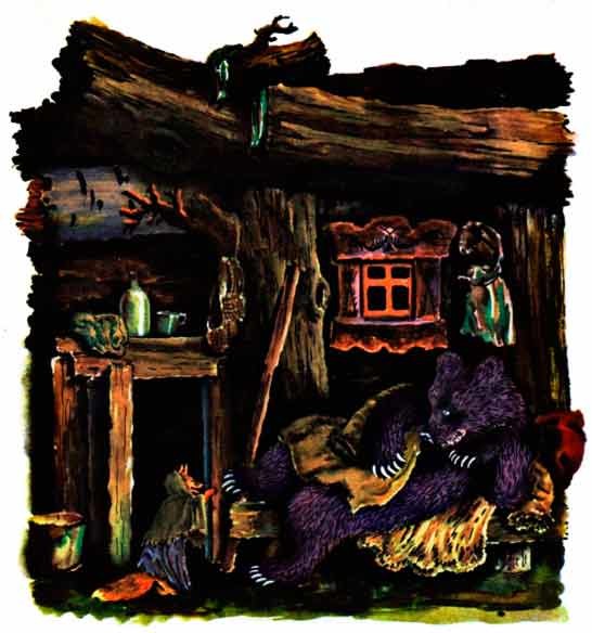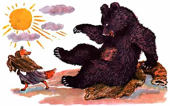 — Я, лисичка-сестричка, сбилась с дороги, вся перезябла и ноженьки отбила бежавши! Пусти меня, добрый человек, отдохнуть да обогреться!
