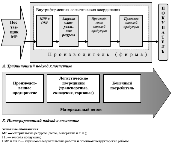 До перехода к рынку в изучении указанных дисциплин, а также практических приложениях научно-исследовательских разработок преобладали территориальный, отраслевой и ведомственный подходы. Участники, по существу, единого логистического процесса в сферах производства и обращения продукции всегда рассматривались изолированно с точки зрения обеспечения своих локальных интересов и целей функционирования в централизованной плановой экономике.