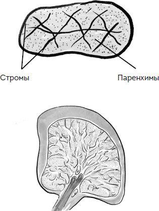 Паренхиматозные органы состоят из СТРОМЫ (мягкий опорный каркас из соединительной ткани) и паренхимы (железистая ткань, обеспечивающая выполнение функций конкретного органа). То есть, в отличие от трубчатых органов, паренхиматозные не имеют внутренних полостей.