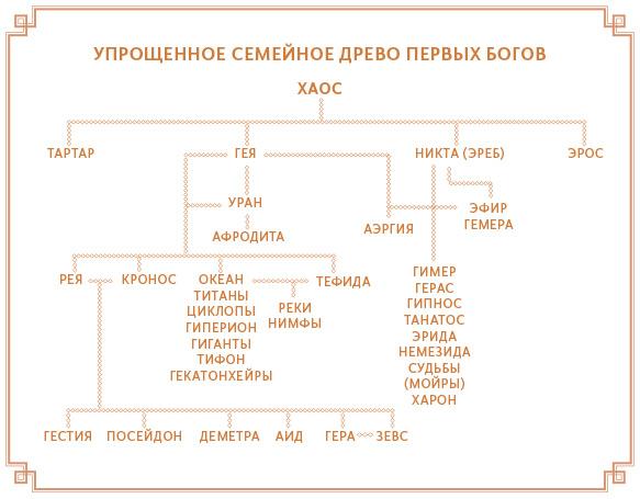 Боги также способны были передавать некоторые свои обязанности потомству. Так что мир мифов можно представить себе как огромный каскад, струящийся по всем частям света: каждый бог создает и занимает определенную нишу и рождает детей, которые заполняют вспомогательную нишу уровнем ниже. Например, Тефида, дочь Геи, стала супругой Океана, и от их союза произошли великие реки земли, а уже от рек — тысячи нимф, каждая из которых обитала в собственном гроте или пещере.