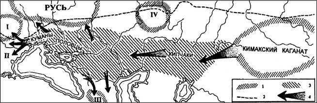 / – Венгрия; II – Болгария; III – Грузия; IV – Волжская Болгария. 1,2 – северная граница степей; 3 – кочевнические общности; 4 – основные направления кочевнической экспансии в конце X–XIII вв.(По С.А. Плетневой)