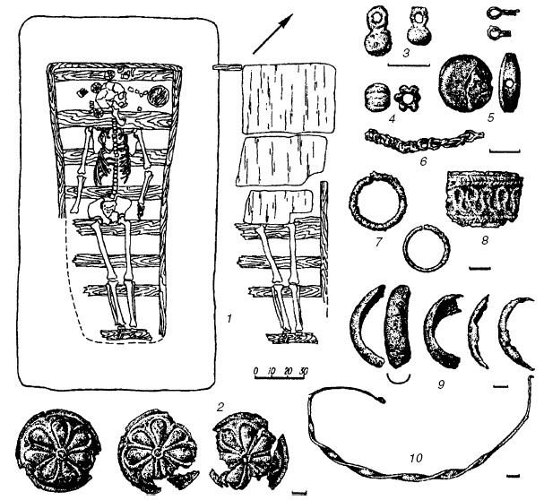 1 – погребение с остатками гробовища; 2 – полусферические бляхи, плакированные золотом в виде семилепестковых розеток; 3 – бронзовые пуговицы; 4 – пастовая бусина; 3 – янтарная бусина; 6 – серебряная цепочка; 7 – серебряные колечки; 8 – бронзовая, плакированная золотом пластина; 9 – бронзовые, плакированным золотом дуговидные пластины; 10 – серебряная шейная гривна. Город Орджоникидзе Днепропетровской области