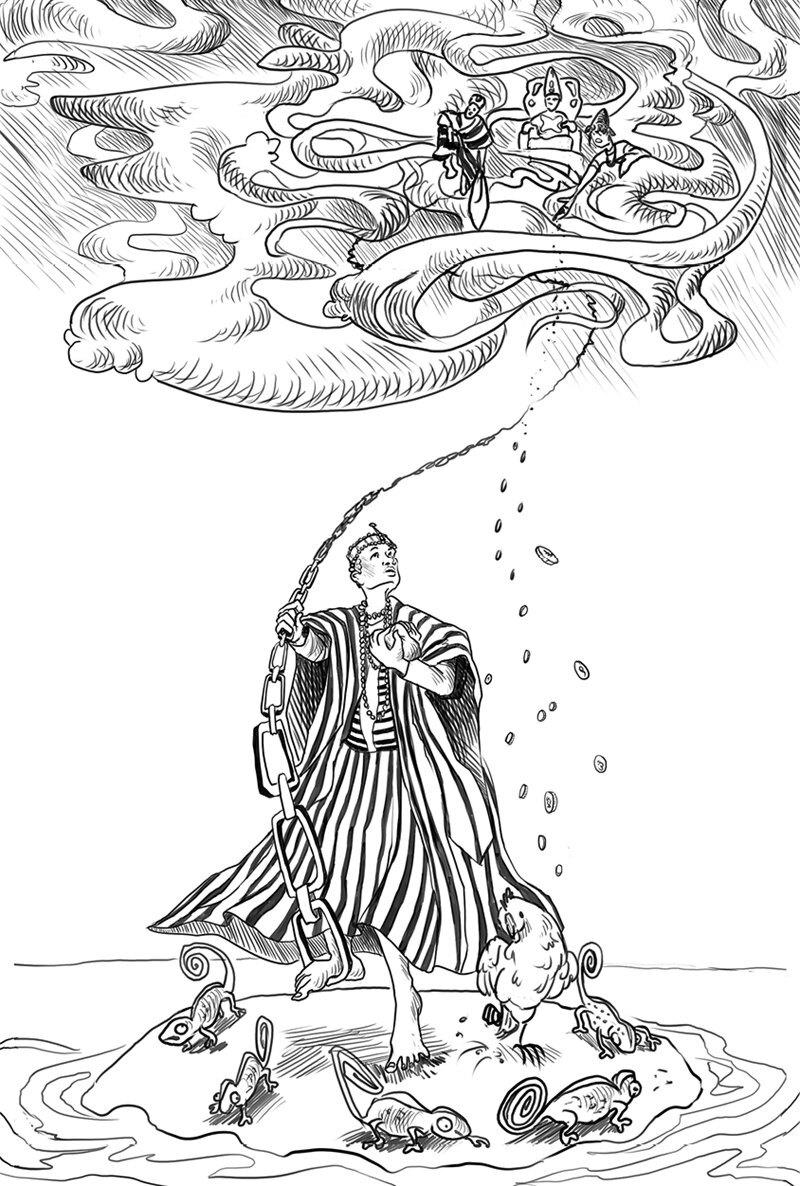 Олодумаре всегда наблюдал за своими детьми с небес. Сердце его сжималось при виде их страданий и безуспешных попыток построить процветающий мир. Он видел, как Одудува, укравший священный мешок Мудрости у своего брата, с отчаянным криком продолжал разбрасывать Песок Силы все дальше, порождая изрезанную шрамами сушу, похожую на состояние смятения и уязвленности, царившее у него в душе. Одудува сам понимал, что не сможет передать людям древние знания и искусства, хранящиеся в мешке Мудрости, – ведь он сам не знал, что с ними делать. Содержимое предназначалось Обатале, знающему сердцем все ремесла и искусства небесной обители. Одудува осознавал несовершенство своего мира. Охваченный парализующим чувством гнева и бессилия, он тщетно пытался завершить свое творение подобно великому Олодумаре, но свет и красота ускользали от него, будто испугавшись его мрачной сути. Бушующий океан отказывался подчиняться и все время грозил снова завоевать созданную Одудувой сушу. Долгие годы, не измеряемые ни солнцем, ни луной, превратились для него в череду тяжких страданий.