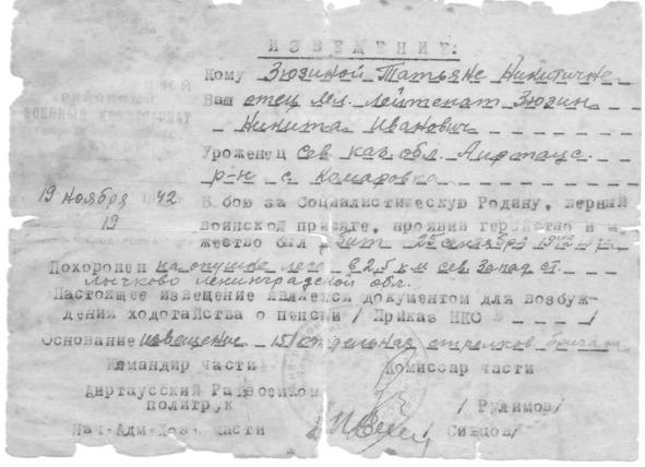 Осенью этого же 1942 года нас опять постигла ещё одна страшная беда: пришла так называемая в народе «похоронка», в которой сообщалось о гибели отца на войне. В извещении на имя сестры Татьяны, которое сохранилось до сего времени у нас, дословно сообщалось следующее: «Ваш отец мл. лейтенант Зюзин Никита Иванович… В бою за Социалистическую Родину, верный воинской присяге, проявив геройство и мужество, был убит 25 сентября 1942 года. Похоронен на опушке леса в 2,5 км сев-запад. ст. Лычково Ленинградской обл.». Все эти события мне не запомнились, знал их только по рассказам родственников.