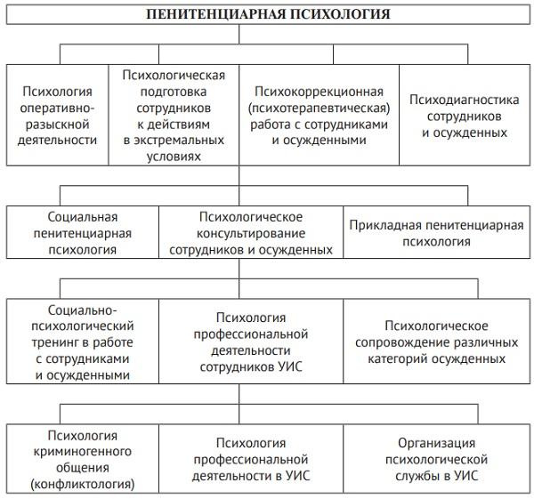 Таким образом, пенитенциарная психология — это отрасль психологической науки, которая изучает психологические явления (факты), механизмы и закономерности их возникновения и проявления в процессе исполнения и отбывания уголовного наказания, а именно закономерности и механизмы поведения осужденных, социально-психологические явления, возникающие в их среде, а также эффективность средств воздействия, применяемых сотрудниками исправительных учреждений в процессе исполнения различных видов наказания.