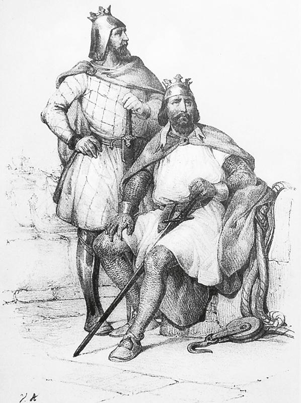 Роберт Гвискар (стоит) и его брат Рожер Сицилийский. Литография. Начало XIX в.