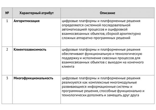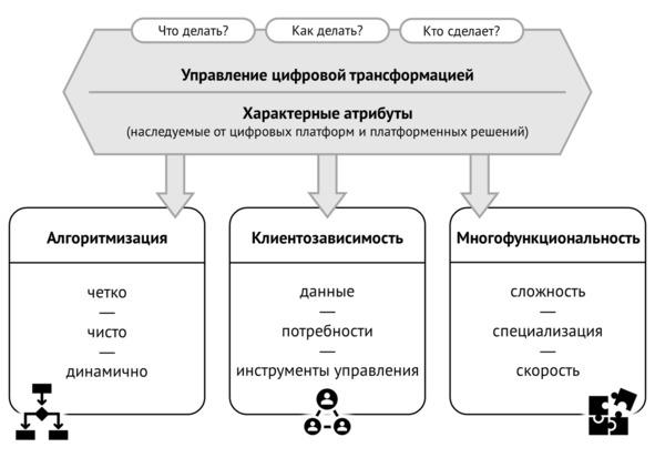 В свою очередь, цифровые платформы и платформенные решения обладают характерными атрибутами, существенно влияющими на подходы допустимые и необходимые для управления цифровой трансформацией. Три самых приоритетных из них: алгоритмизация (1), клиентозависимость (2) и многофункциональность (3).
