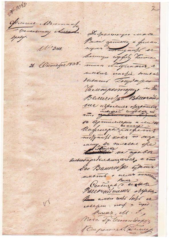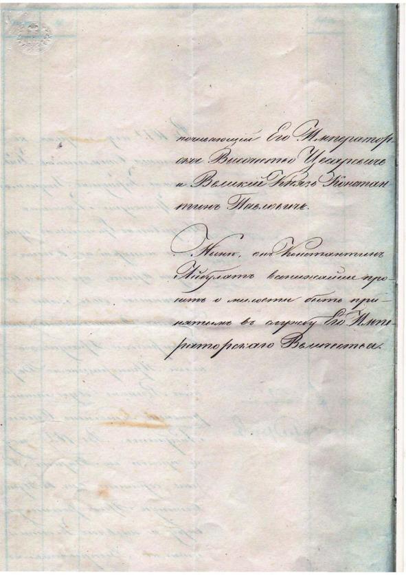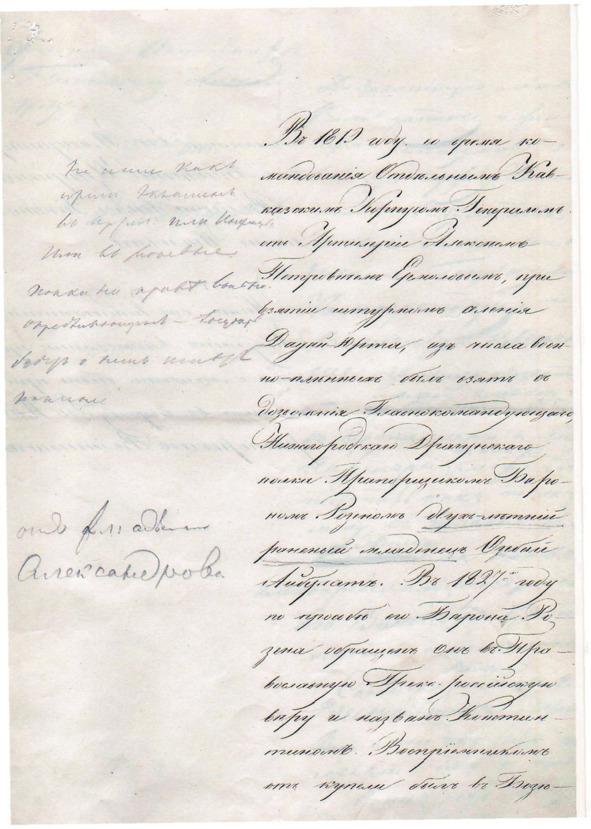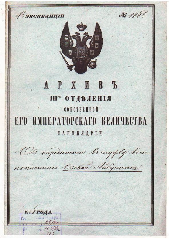 «Въ 1819 году во время командования отдельнымъ кавказскимъ корпусомъ, генераломъ отъ артиллерии Алексеемъ ПетровичемъЕрмоловымъ, при взятии штурмомъ селения Дады-юрта, изъ числа военнопленныхъ былъ взятъ съ дозволения главнокомандующего Нижегородского Драгунского полка, прапорщикомъ барономъ Розеномъ двухлетний раненный младенецъ Озибай Айбулатъ. Въ 1827 году, по просьбе его, барона Розена, обращенъ онъ въ православную Греко-российскую веру, и названъ Константиномъ. Восприемникъ отъ купели былъ въ Бозе, почивший его императорское высочество Цесаревичъ и великий князь Константинъ Павловичъ. Ныне онъ Константинъ Айбулатъ всенижайше проситъ о милости быть принятымъ на службу его императорского величества». // Подписано (Флигель-адъютант полковник граф Александров Павел Константинович). Ф. 109. ГАРФ