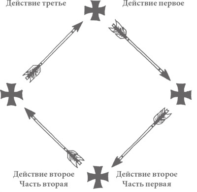 Общаясь с коллегами в Риме, я сделал еще один шаг в развитии этой идеи: теперь графическое отображение путешествия героя стало видеться мне не как окружность, а как ромб. Это произошло, когда я объяснял, что каждое действие ставит перед персонажем определенную задачу, предписывая ему определенное направление движения, а кульминации выполняют функцию поворотных моментов, заставляя героя ступить на новую тропу и устремиться к новой цели. В первом акте он, к примеру, ищет клад, но, встретив свою потенциальную любовь в момент преодоления первого порога, меняет цель и начинает добиваться расположения прекрасной девы. Наступает момент испытания: злодей похищает влюбленных. Теперь их цель — вырваться на свободу. И если злодей убивает одного из беглецов, спешащих домой, то выживший клянется отомстить — и это его новая цель. Изначальная цель тоже может быть достигнута, или возможна некая сверхзадача (обрести уверенность в себе или смириться с прошлыми неудачами), которая сохраняется при всех поворотных моментах, когда герой меняет свои внешние цели.