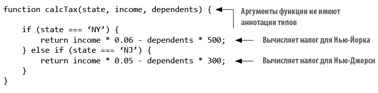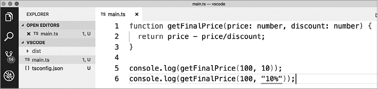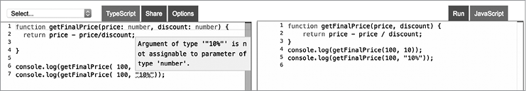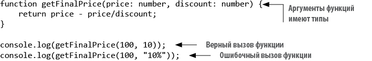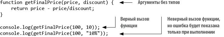 Это достаточно простая функция, но давайте представим, что кто-то вызвал ее, сообщив скидку в виде строки. В этом случае функция в среде выполнения выдаст ошибку NaN.