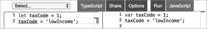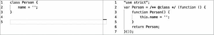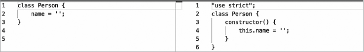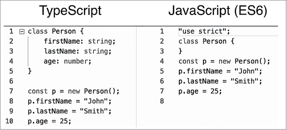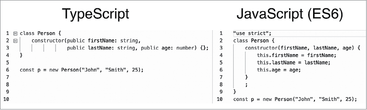JavaScript не имеет синтаксиса для объявления свойств классов, но в TypeScript такой синтаксис присутствует. На рис. 2.2 слева вы можете видеть, как мы объявили и инстанцировали класс Person с тремя свойствами. Справа видна версия ES6 кода, произведенного компилятором TypeScript.