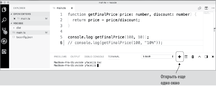 Разница между транспиляцией и компиляцией в том, что последняя преобразовывает исходный код программы в машинный байт-код, в то время как транспиляция конвертирует программу из одного языка в другой (например, из TypeScript в JavaScript). Однако в сообществе TypeScript все же более распространен термин компиляция, поэтому его мы и будем использовать в этой книге для описания процесса преобразования TypeScript-кода в JavaScript.