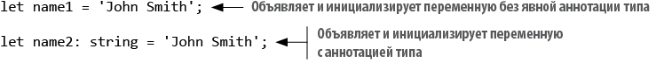 Такая аннотация типа здесь необязательна. Так как вы объявляете константу p и тут же инициализируете ее с объектом известного типа (Person), модуль проверки типов сможет легко вывести и присвоить ее тип. Сгенерированный код JavaScript будет выглядеть так же, независимо от того, укажете вы тип p или нет. Вы можете увидеть, как инстанцировать класс Person без явного объявления его типа, в интерактивной среде TypeScript по адресу http://mng.bz/zlV1. Наведите курсор на переменную p — ее тип отобразится как Person.