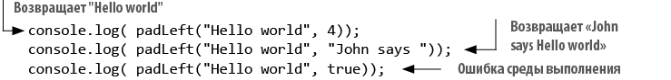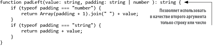 Если теперь мы изменим тип padding на объединение string и number (как показано в следующем листинге), то компилятор сообщит об ошибке, если вы попробуете вызвать padLeft(), предоставив что-либо, кроме string или number. Это также устранит необходимость выбрасывания исключения.