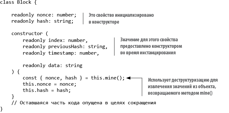 В главе 8 мы начнем разработку блокчкейн-приложения, а любое такое приложение состоит из блоков с неизменяемыми свойствами. Это приложение будет включать класс Block, чей фрагмент приведен ниже.