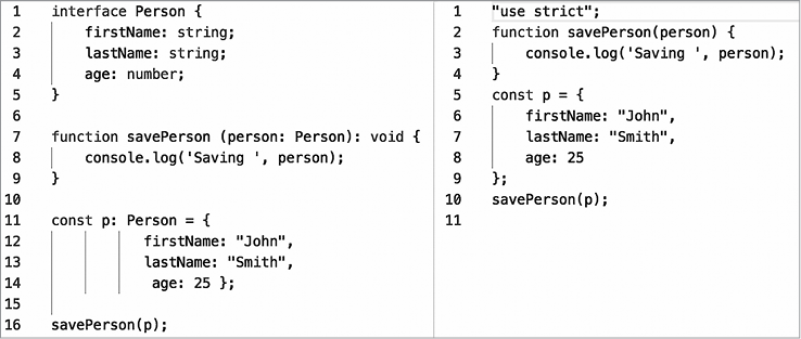 В правой части рис. 2.4 нет никакого упоминания интерфейса и JavaScript более лаконичен, что хорошо для любого развертываемого кода. Однако в процессе разработки компилятор проверит, чтобы объект, предоставленный в качестве аргумента функции savePerson(), включал все свойства, объявленные в интерфейсе Person.